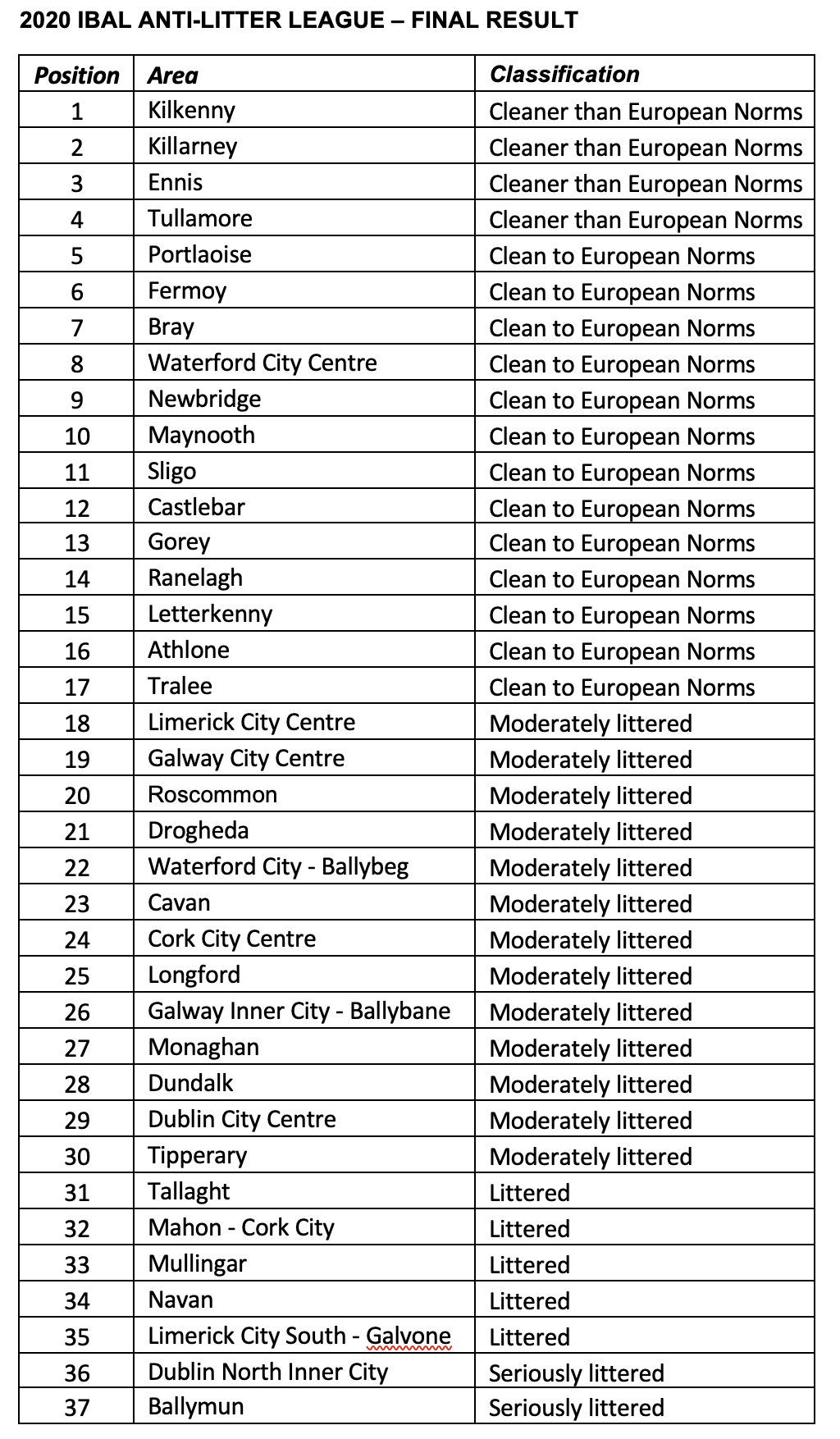 In all, litter levels rose in 24 of the 37 towns and cities inspected by An Taisce at the end of 2020, resulting in only 17 being judged to be clean – a fall of over 25% on last summer and in sharp contrast to just 3 years ago, when 80% were clean. Retaining its title from last year, Kilkenny won out over Killarney, Ennis and Tullamore at the top of the IBAL table.