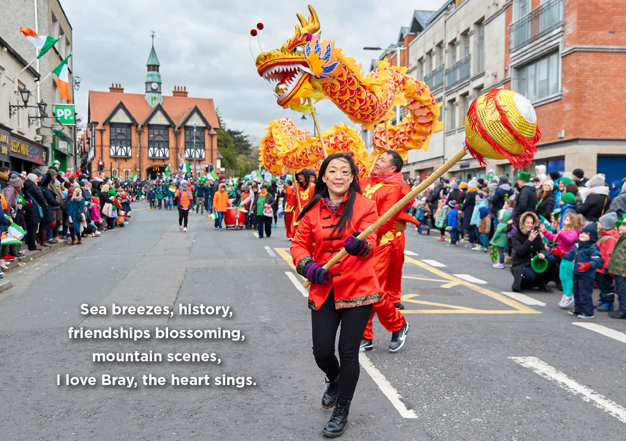 The image portrays an aspect of what we think makes Bray’s heritage unique and how it connects the community. Iconic photographs of Bray have been posted to Bray.ie, Bray Open Forum and other Bray Groups have hit a chord with large sections of the Bray community we have chosen one of these. Two of Bray’s annual main events are the St. Patrick’s day parade and the Airshow. The Medieval Bray Project has chosen a brightly coloured and uplifting scene from a St. Patrick’s day parade not too long ago, reminding us of when we could celebrate together and giving us hope that our strong, active and diverse community can and will celebrate together again.
