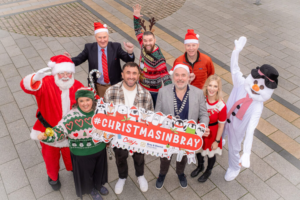 Pictured above at the launch of the Christmas in Bray 2025 marketing campaign are Jonathan Donnelly of Bray Chamber, Brian Wildes and Stephen Fox of Wicklow County Council, Adam Burke, Councillors Caroline Winstanley and Ned Whelan, Bray MD Cathaoirleach Erika Doyle, Frosty and Santa Claus, crowds at Bray’s Christmas Lights Switch-On, and Garda Joe and Sean swiftly intercepting the Grinch in late November.